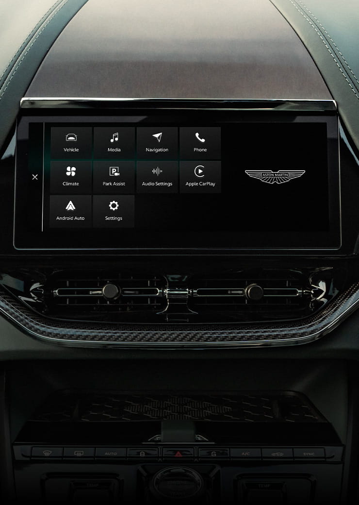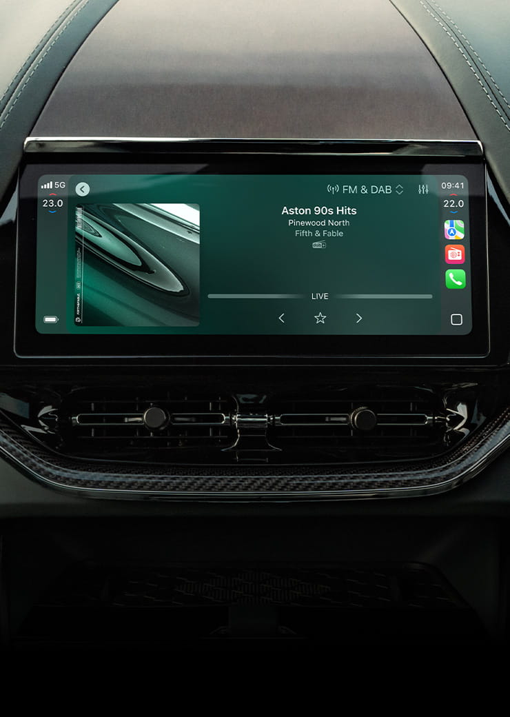 Nowa generacja CarPlay® łączy to, co najlepsze w Aston Martinie i w iPhonie – w pełni zintegrowane, spójne doświadczenie. Po uruchomieniu silnika CarPlay Ultra® działa równocześnie na centralnym ekranie i – po raz pierwszy – w zestawie wskaźników kierowcy. System prezentuje kluczowe informacje, takie jak prędkość, obroty silnika, poziom paliwa i aktualny bieg, a także pozwala sterować klimatyzacją, ogrzewaniem i systemami bezpieczeństwa. To światowy debiut technologii, która wyznacza nowy standard integracji, personalizacji i intuicyjnej kontroli w samochodach klasy GT.