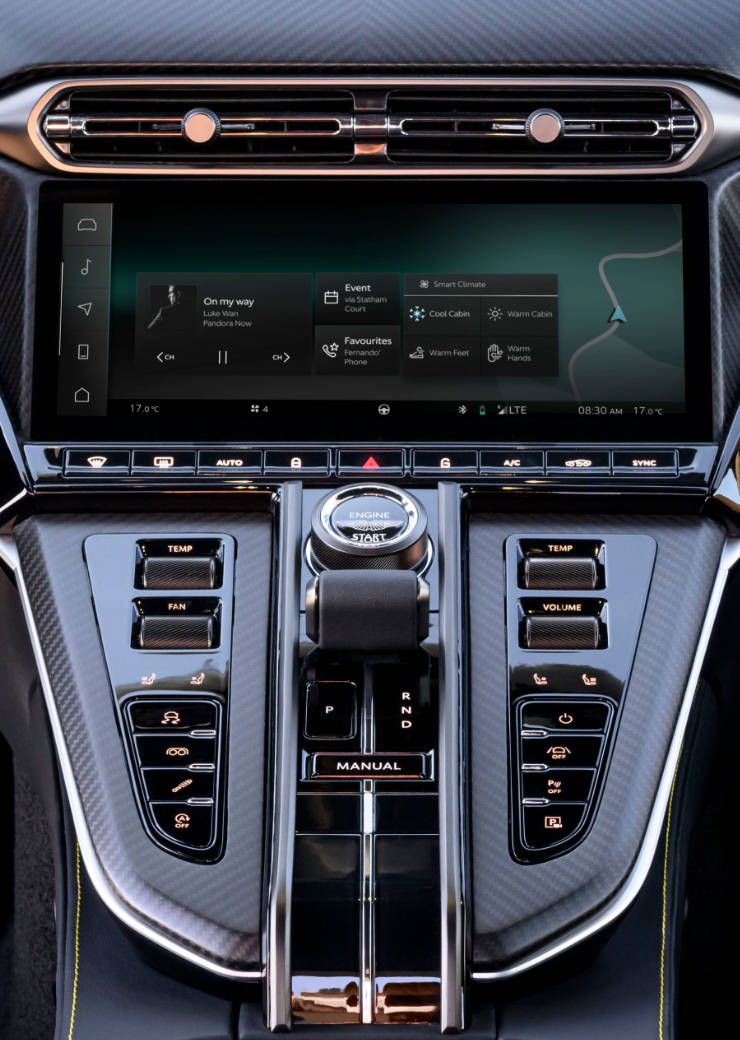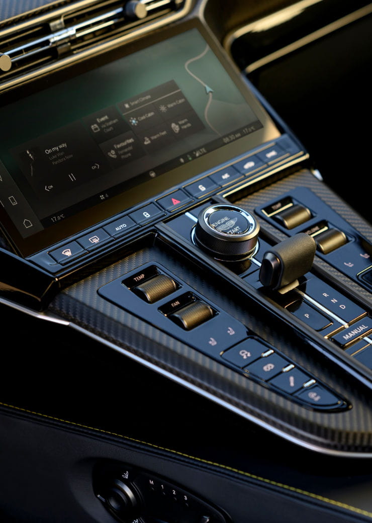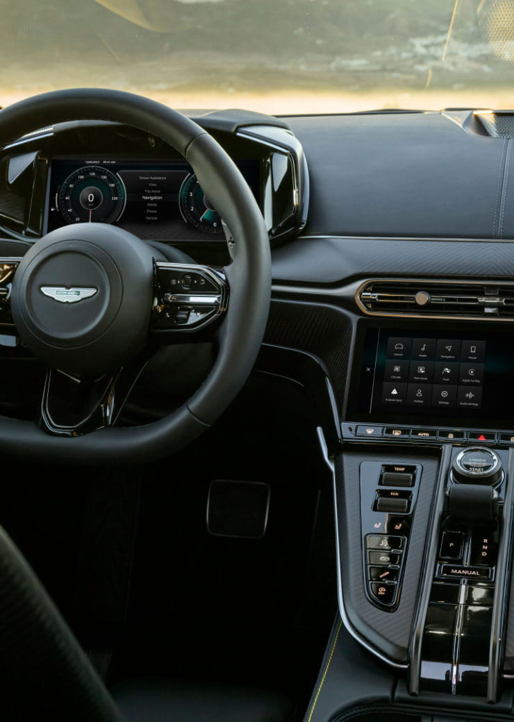 Serce Twojego Vantage to epicentrum emocji z jazdy. Czyste, nieprzerwane linie. Smukłe, stylowe wloty powietrza. Imponujące, a zarazem eleganckie wnętrze. Skupione wokół konsoli centralnej, ożywiane ekscytującym naciśnięciem przycisku start. Metalowe, precyzyjne pokrętło zaprasza do odkrywania pięciu trybów jazdy. Szczegółowe polecenia możesz wydawać dotykiem lub głosem.